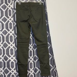 Olive green pants with silver zippers and back pockets