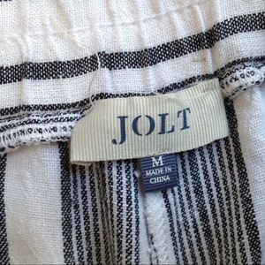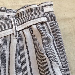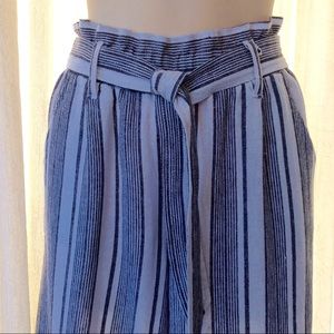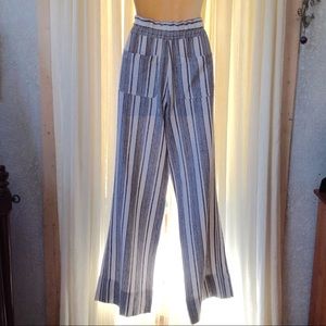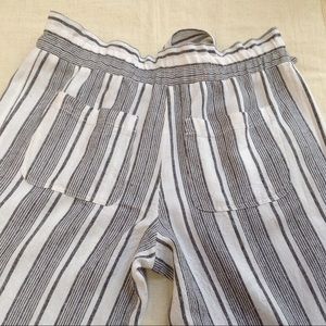 NWOT!! Wide leg, linen and rayon blend, these gray and white striped pants are adorable. Pull on, side pockets, elastic and ruffled waist band with front ties. 31" inseam.
