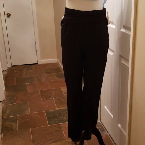 Black straight leg pants. Side zippered pockets. Wide comfort fit waistband. Back buttoned pockets. Size M. Viscose, rayon/elastane. 'Pure DKNY'. NWT