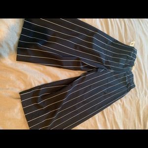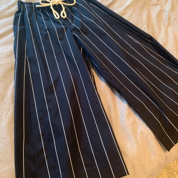 Never worn, split wide leg, cropped, navy with white pinstripe Vince pants. Super comfortable as the fabric on the legs has splits for easy movement. Off white drawstring. NWT. Size XS.