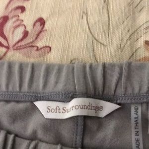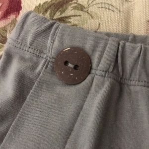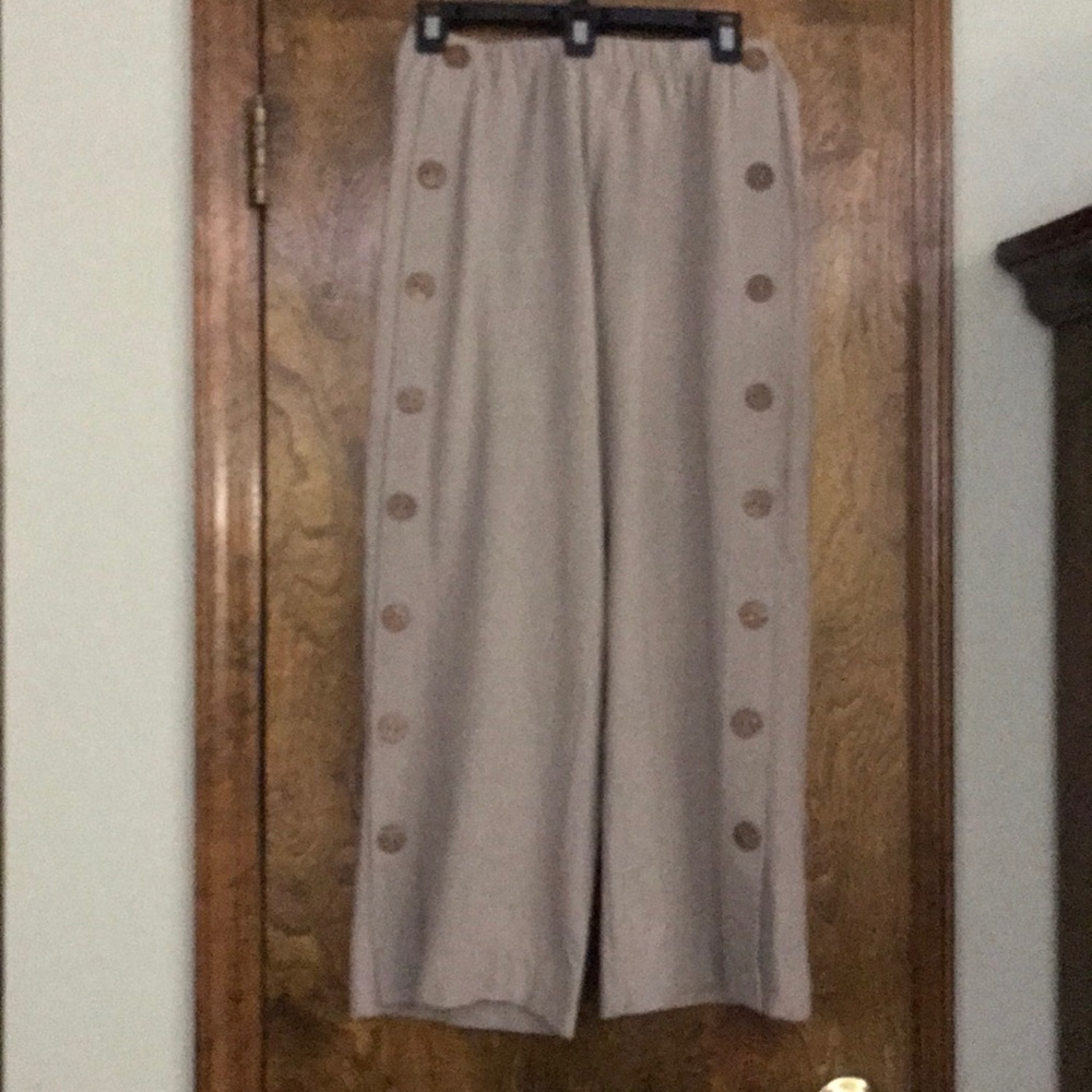 Tan cropped pants with pull on elastic waistband. Eight wood buttons along each side 92% cotton 8% spandex.