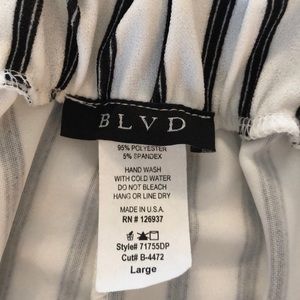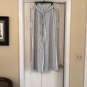 BLVD fun and funky white/black stripe wide leg pants. Size large. 95% polyester 5% spandex. Front tie. Back elastic waist. Inseam approximately 30”. Smoke free home.