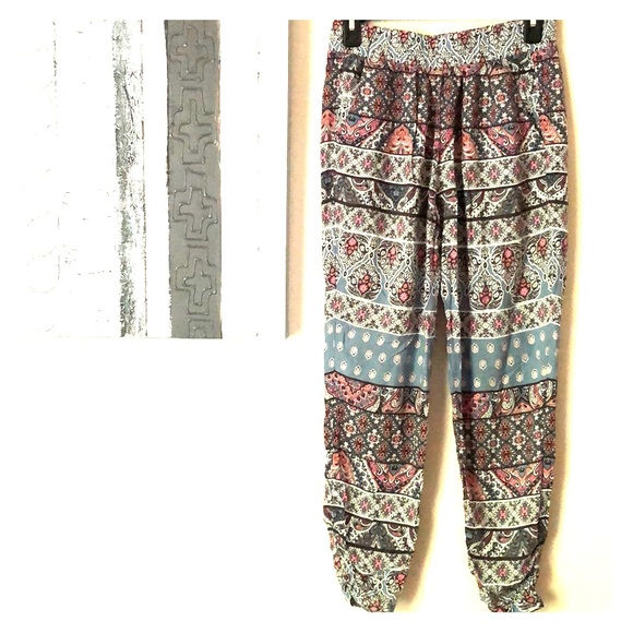 Light blue, pink and white patterned pants that gathers at the ankle. Super comfy and have only worn a couple times. In perfect condition