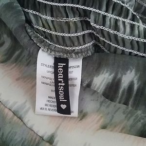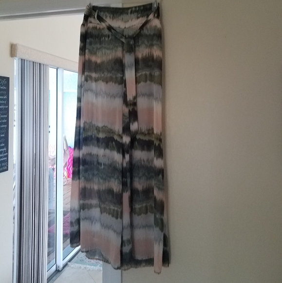 Polyester palazzo pants. Muted tones. Elastic waist. Attached belt.