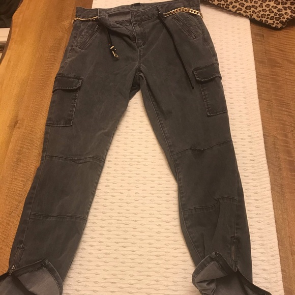 Cute pants with cargo pockets, zip accents on top and at ankles. I liked to wear slightly unzipped and half rolled to accent the ankle zipper. Has a slight rip on knee stitching otherwise good condition. Priced accordingly.