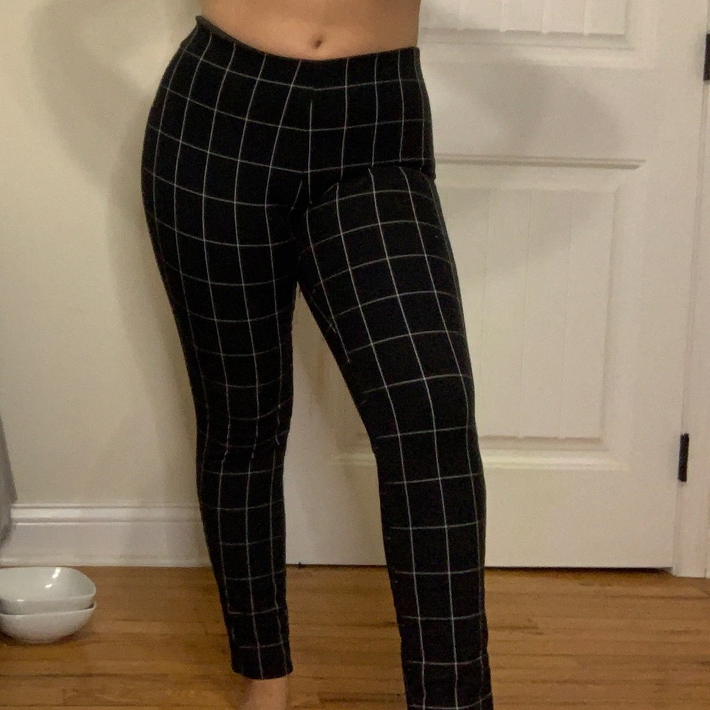 Black pants with white grid lines on them, legging type fit with side zipper and button, extremely comfy, soft, and stretchy. Great condition