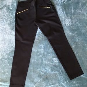 G by Guess Black Pull On Skinny Pant. Single gold tone zippers, faux pockets in front. Faux pockets on back with G gold tone embellishment. 75% Rayon 22% Nylon 3% Spandex.