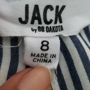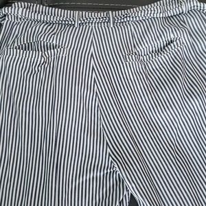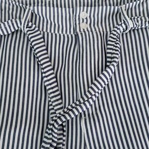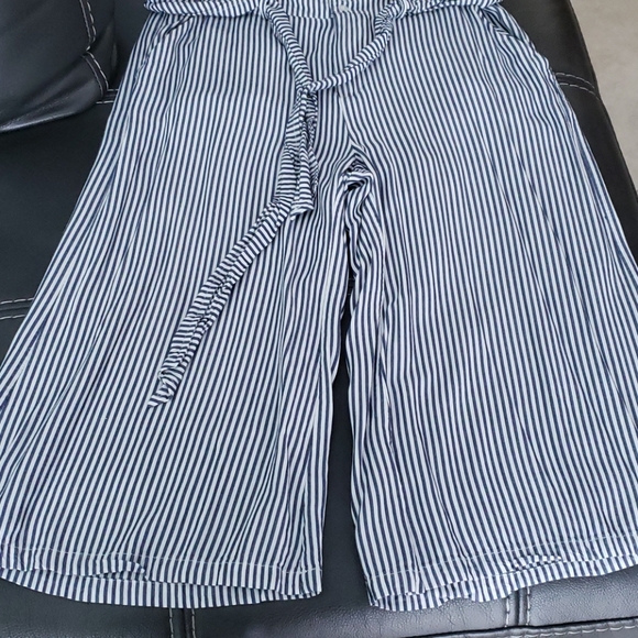 Blue and white rayon culotte pants. Pockets at the sides and back. No rips, stains. Worn once. 27.5 inches. inseam 17 inches. Zipper and button front opening, with sash to tie around waist.