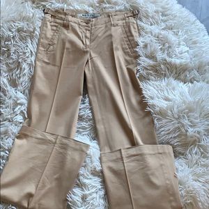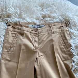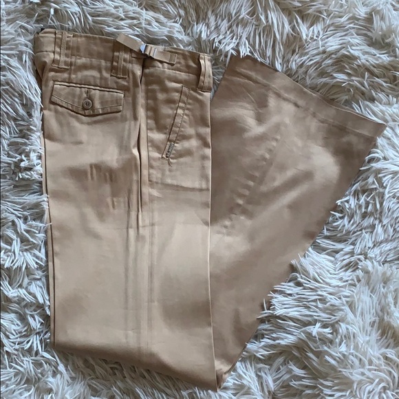 Tan pants tight in the leg with bell bottom. Fit very, very well.