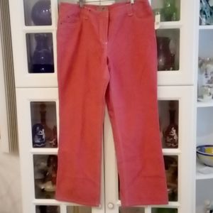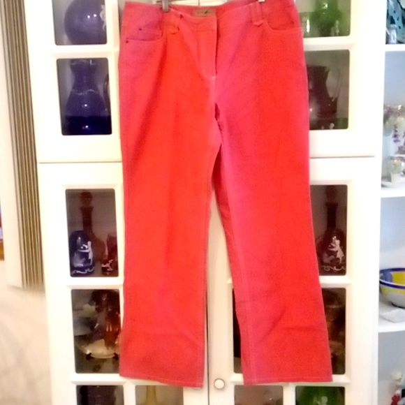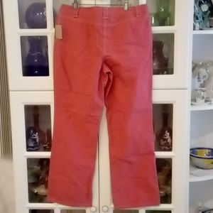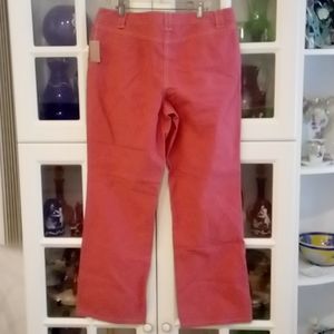 Pretty pants in a coral pinkish color with white piping. Made of cotton. Pockets on front with belt loops if needed. Zip up closure with button & slide. Brand New!