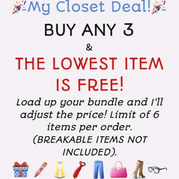 Any 3 items and the lowest is free. Limit 6, non breakable only.