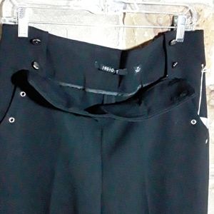 Nautical Style wide leg pants with front button closure. 61% polyester 33% rayon 6% spandex dry clean. 32in inseam. 11 and a 1/2 inch leg opening.
