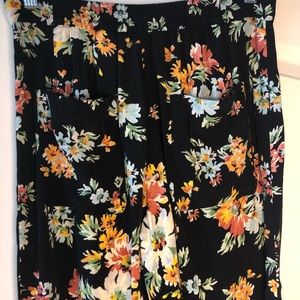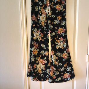 Very nice floral flare leg pants. Flowery material and feels good to the touch with back pockets.