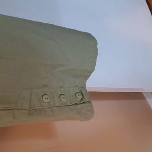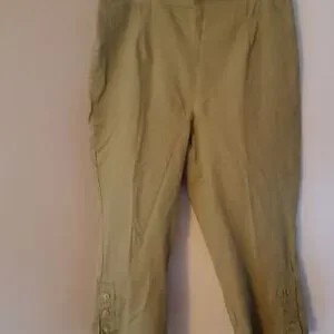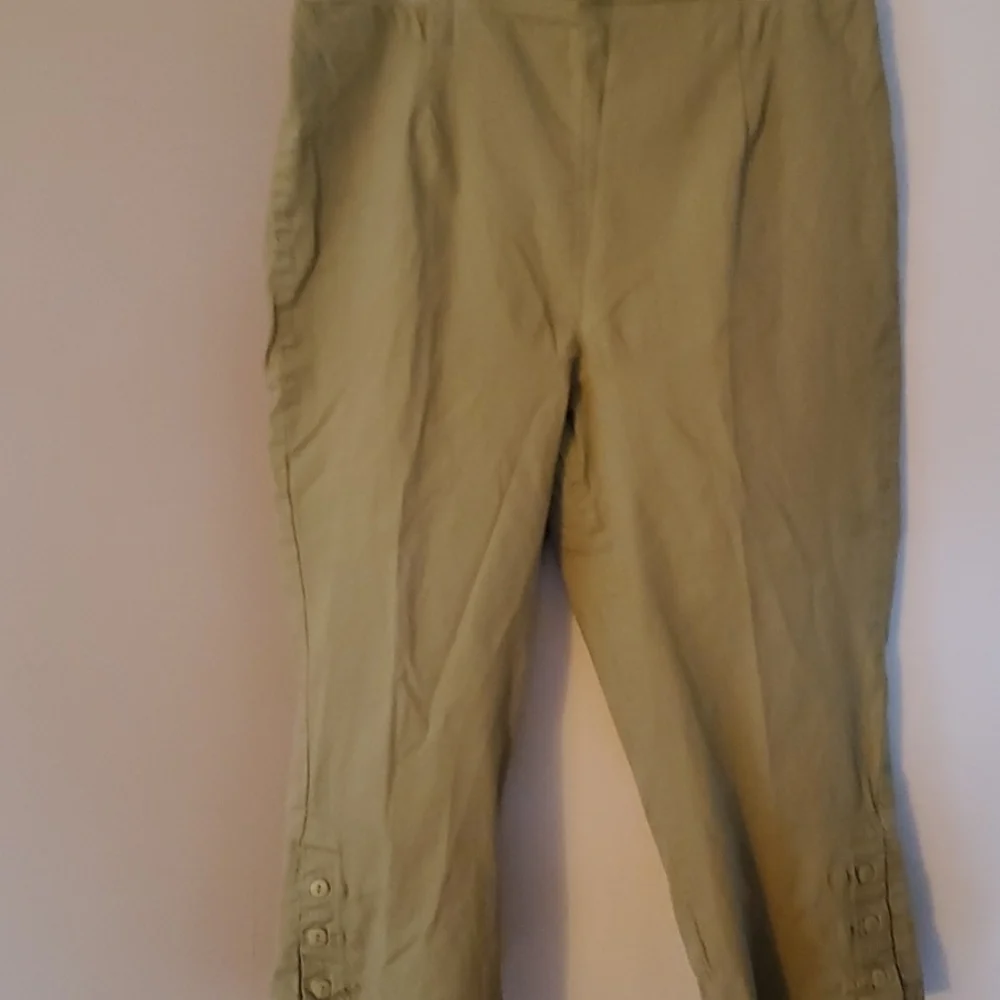 light green xlarge, cropped pants. liked them so much, I bought 2 pairs at different times! Light weight, 96% cotton and 4% spandex. Functional and decorative button on bottom outer legs.
