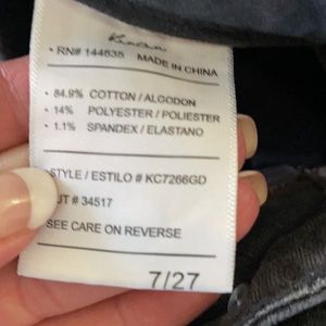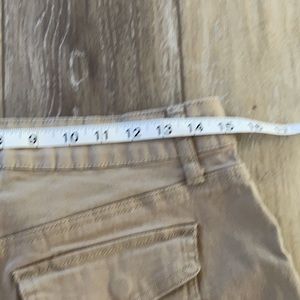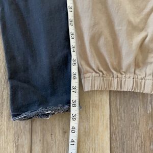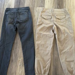 This price is for two pairs of pants gray pants are Kancan size 7 and tan pants are royalty size 6 both are stretchy material. Gray has distress at ankle. Please see photo for length and waist. Both are brand new without tags.
