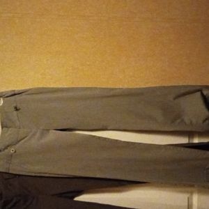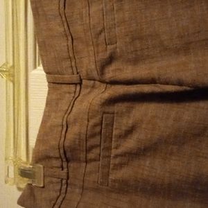 this is a pair of Tracy Evans polyester and cotton Capri pants size 3 zipper and button closure front and back pockets.by Tracy Evans limited ai have brown dark green and charcoal gray