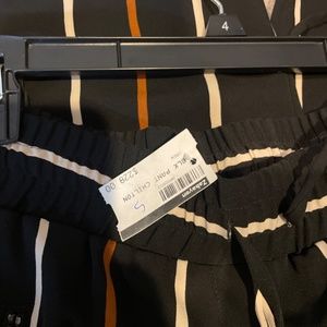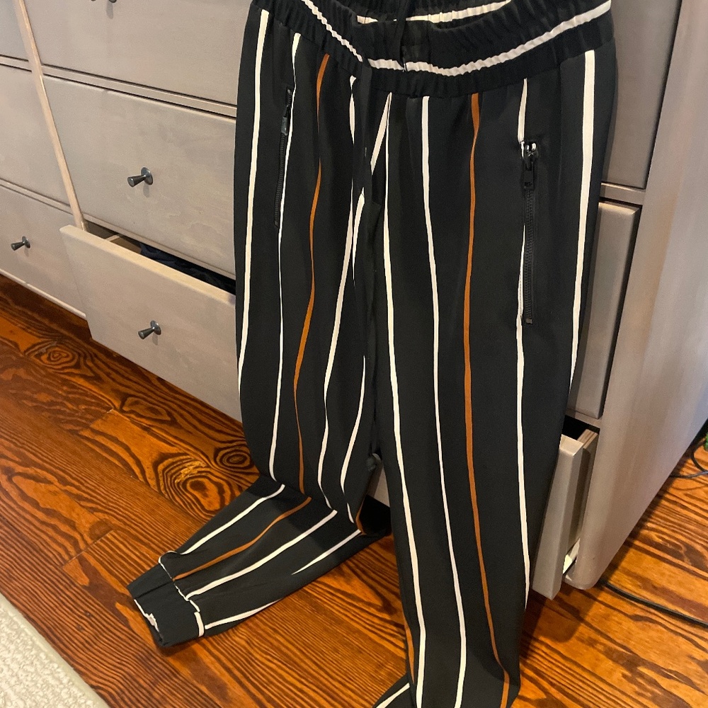 New w tags. $228 retails. Silky woman’s pants beautiful and new. Black w stripe. Great with heels or with a sneaker and tshirt.