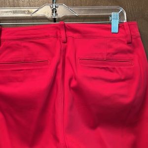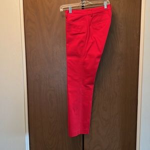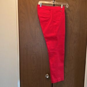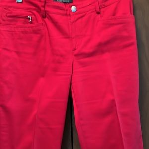 Pants are 98% cotton 2% Elastane two pockets in the front and two pockets in the back of the pants and small zipper pocket in the front; zipper in the front of the pants and a snap