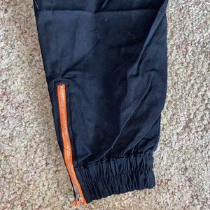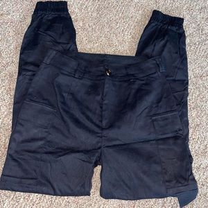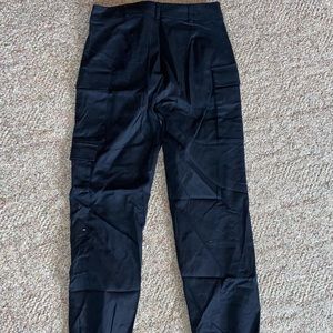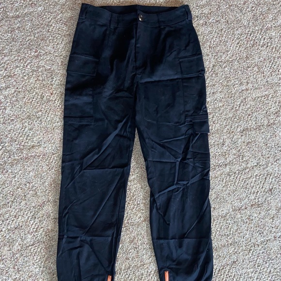 Black cargo pants. Skinny leg. Zipper on ankle.