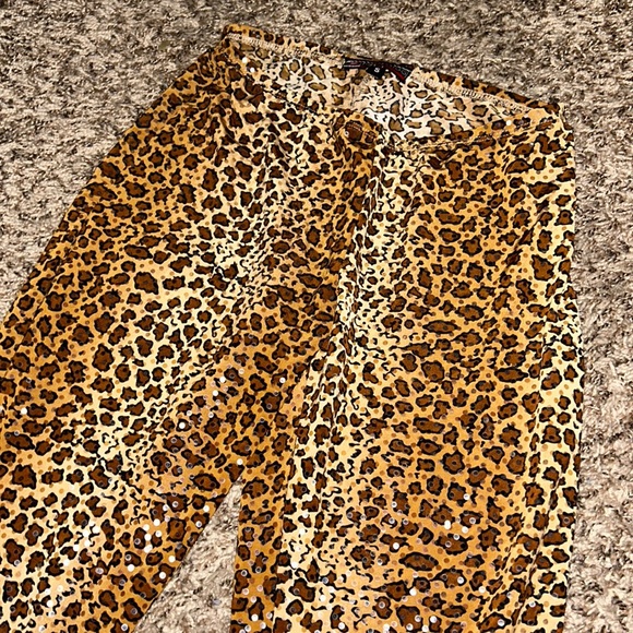 Sparkle print pants that flare at end . They are size small but don’t have much stretch with the sparkles