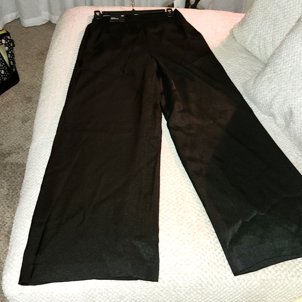 Wide leg high rise black satin pants with pockets and elastic waist.