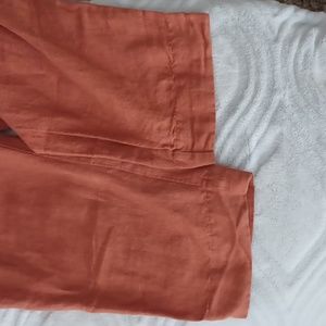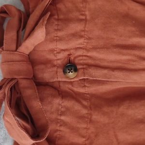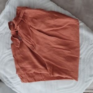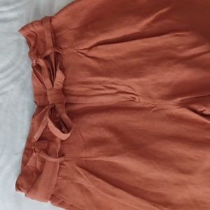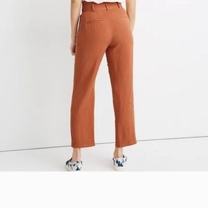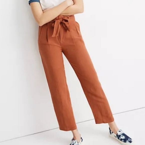 Madewell Linen Blend Paperbag Pants. Color is "Afterglow red" which is a burnt orange. They are crop ankle length. button and zulipper closing in front with a tie around waiste as well. Front and back pockets. Only worn a couple times so they are in really good condition.