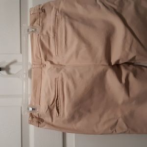 Old navy harper mid rise slacks. 97% cotton, 3% spandex. these are a slightly heavier weight cotton. very pretty "blushing lip" pink is the listed color.