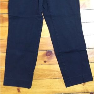 Thick Capri pants. Great for work or out and about. Easy to dress up or down. Solid black. Not stains not marks. The white spots are lint I forgot to pick off. Very clean and comfortable