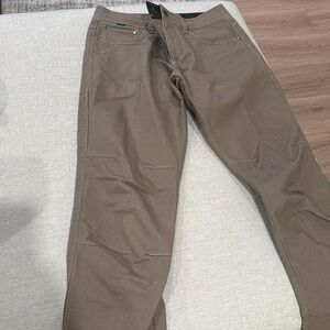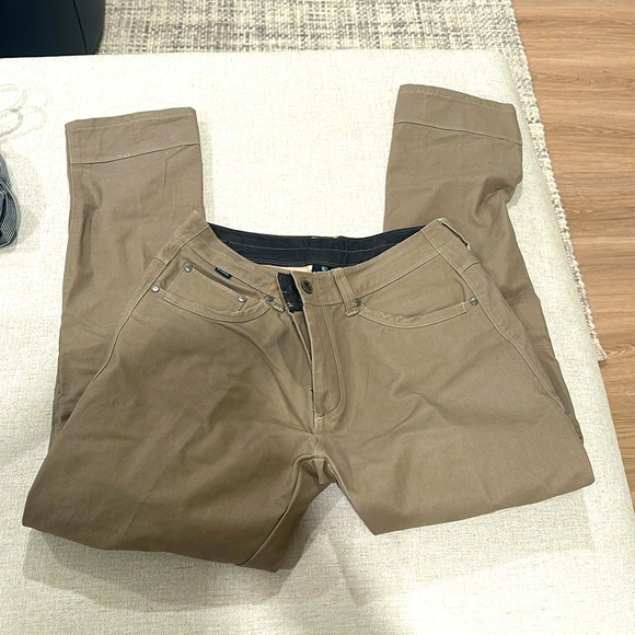 Material is similar to cargo, these do run a little shorter. Worn one time.
