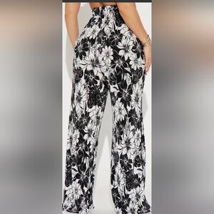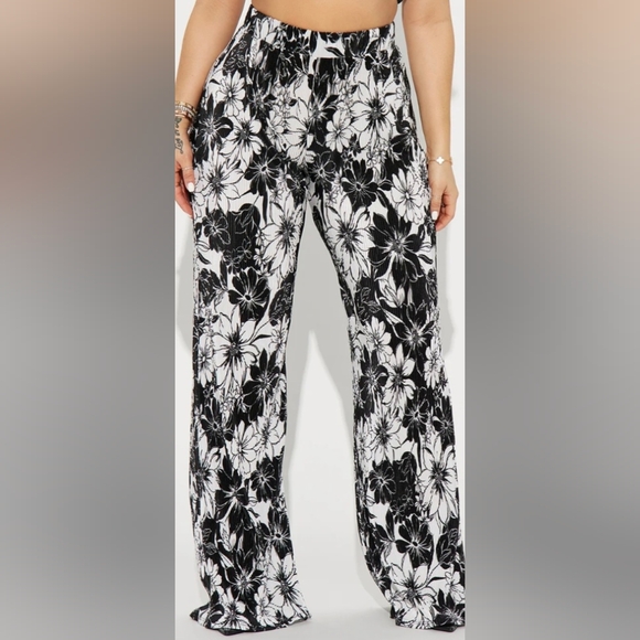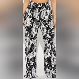 Wide leg plisse pant, mid rise with elastic waist, printed and stretch.