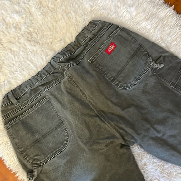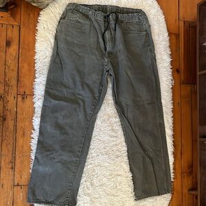 Mens, green, Dickies cargo pants. My son added a drawstring to these, going for the baggy skater look, so the waist can be adjusted