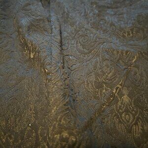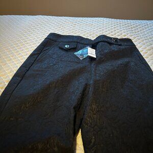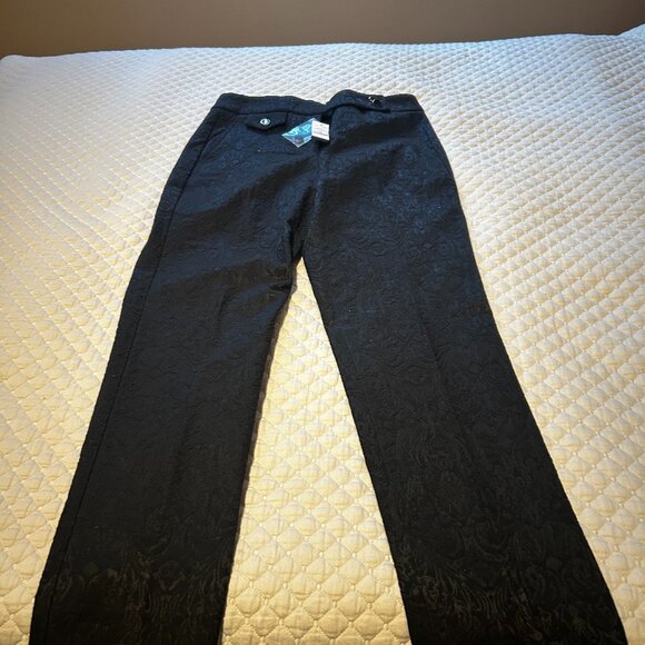 Straight Leg Pants, material has a nice shine finish to it which makes them dressy. 62% cotton, 35% polyester, 3% spandex. Never worn. Tag size is 2L but they are not that long. I am 5.4 and the length is just fine with low hill flats.