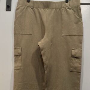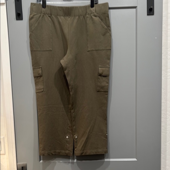 Cotton and spandex cargo pants with pockets and buttons at bottom to shorten pants olive green