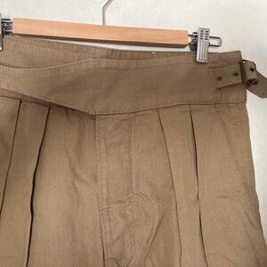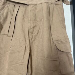 Those cotton 65%/linen 35%blend , wide leg , high waisted pants are beautifully made. The high waistband has crossed belts with side buckles. The color is very universal and looks great with bright colors and toned neutrals.