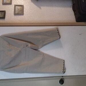 Women's pants/Capris, khaki with black/white circles and black scallops at bottom hem. 16W in size 75% rayon, 22% Nylon and 3% Spandex. machine washable.