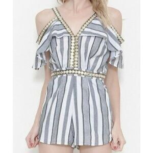 This Striped romper embellished with gold trim detail, cold shoulder style features everyones favorite detail; pockets!