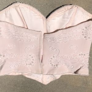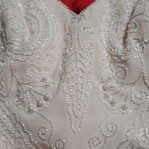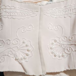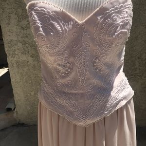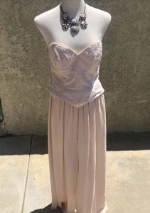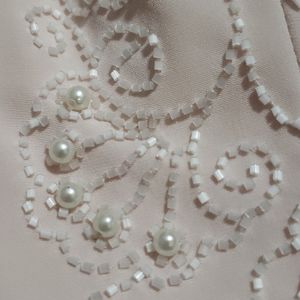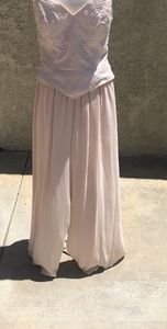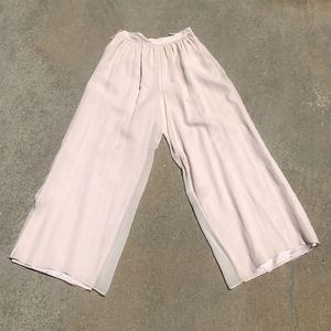 Beautiful and timeless pink 2- piece pants set ... Top (size 10) with bugle beading and pearls all around edges chiffon over silk pants (size 8) with back elastic waist band. Jewelry sold separately.