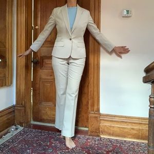 Cotton spandex suit pants/slacks. Not a tapered leg. Not quite straight cut-more boot cut. Sold separately or bundle with jacket (pictured) for $50. Light beige in color. Exact color match w jacket. Barely worn.