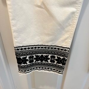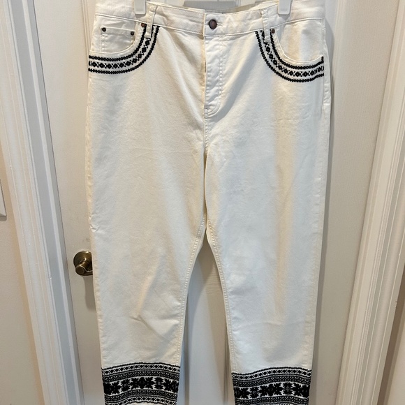 Straight leg jeans from Boden. Only worn once. Ecru with black embroidery. Button fly. Made of cotton. Stretchy material. Size 16/18. Machine wash.