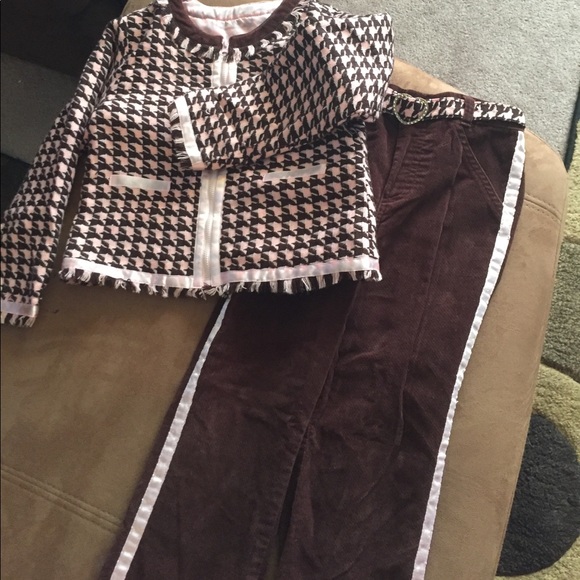 Brown and pink Pants have satin stripe down sides of leg with an attached belt no pockets no zipper. Elastic waist. Jacket has front zipper. Satin trim on sleeves zipper and pockets (no pockets) 100%polyester. Fringe on collar bottom of jacket and sleeves. Absolutely adorable for your little girl ❤️