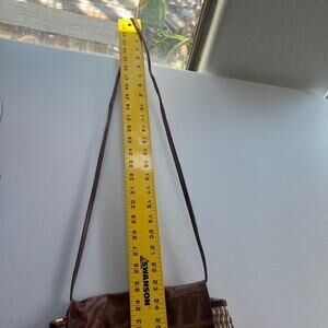 The Paola Del Lungo Purse is a handwoven raffia leather top and strap bag, featuring a rectangular shape with a snap closure. This small-sized purse is perfect for various occasions including travel, weddings, parties, casual outings, formal events, and workwear. The brown raffia and cow leather fabric gives it a vintage look, while the gold-plated hardware adds a touch of elegance. With a crossbody strap handle style, inner pockets, and lightweight design, this purse is both stylish and practical for everyday use. Made in Italy, it showcases a nature-inspired theme with elements of bohemian and retro style.