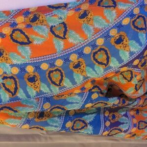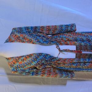 amazing pattern with shades of blues purples and oranges. excellent condition. no rips years or stains. long length. open front with tie at the waist with tassel details. roomy sleeves. 100% silk.
