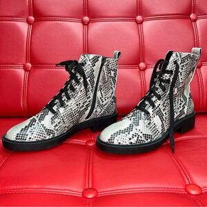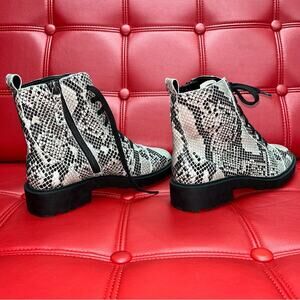 Linea Paolo White & Black Faux Snakeskin Lace-Up Inner Zip Rubber Lug Sole Combat Boots. These stylish boots are perfect for adding a touch of edgy sophistication to any outfit! The faux snakeskin design is eye-catching and unique, while the lace-up front and inner zip closure provide a secure and comfortable fit.
