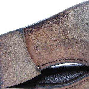 Overall good condition. Frayed around edge of heel. Scratch on right shoe inside outer sole.