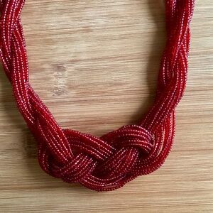 Countless strands of red seed beads are twisted and knotted together to create an unforgettable statement piece. Features an adjustable clasp closure.