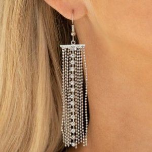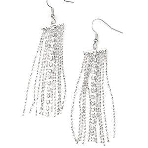 Infused with a strand of glassy white rhinestones, rows of dainty silver ball chains cascade from a dainty silver fitting, creating a refined tassel. Earring attaches to a standard fishhook fitting.
