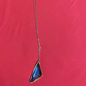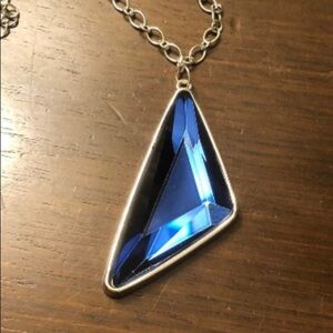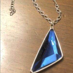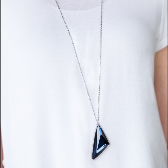 Cut into a striking triangular shape, a faceted blue gem swings from the bottom of a lengthened silver chain for an edgy-glamorous fashion. Features an adjustable clasp closure.