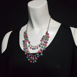 Pink, purple, and green dangling bead three-layer necklace.