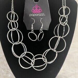 This stunning necklace set from Paparazzi features a double chain design with interconnected silver circles as the main pendant. The hanging circles create a beautiful and modern look that is sure to turn heads. The set comes with matching silver circle earrings to complete the look. The necklace also includes an extender chain for adjustable length. Perfect for dressing up any outfit or adding a touch of elegance to your everyday look. Don't miss out on this stylish and versatile accessory! Please check the photos and measurements carefully before placing the order.