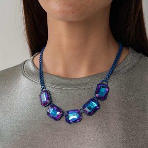 Featuring a vivacious blue chain, a collection of purple UV shimmery emerald-cut gems, pressed in vibrant blue frames, coalesces around the collar to create a playful pop of edgy color. Features an adjustable clasp closure.